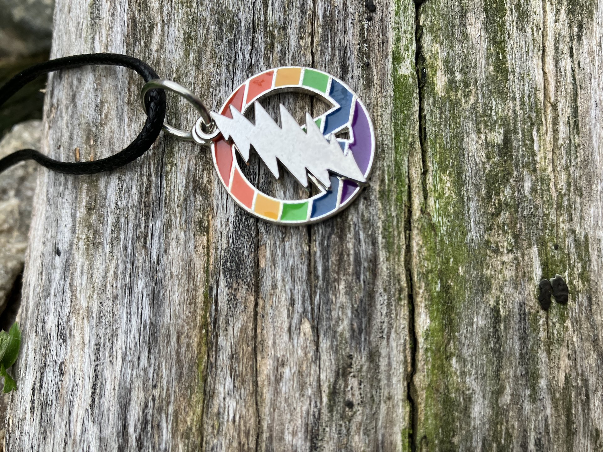 Beautiful Grateful Dead 13 point lightning bolt with rainbow enamel peace sign pendant on black cotton cord