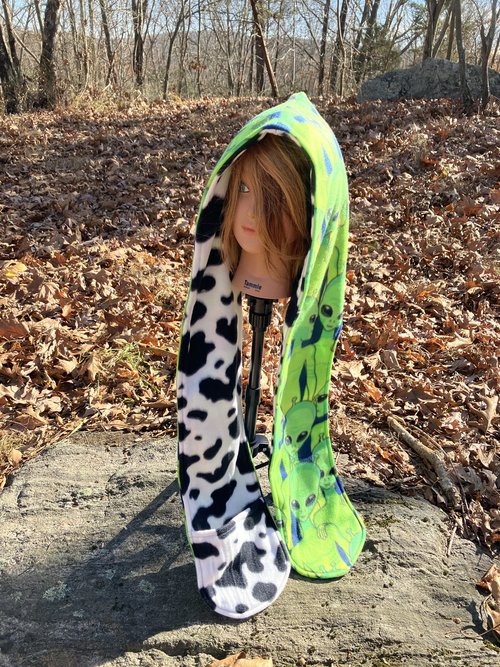 Handmade by Lucky Burrito Beautiful XL Hooded Scarves inspired by the designs of Sienna Rose* fully reversible aliens and cow print