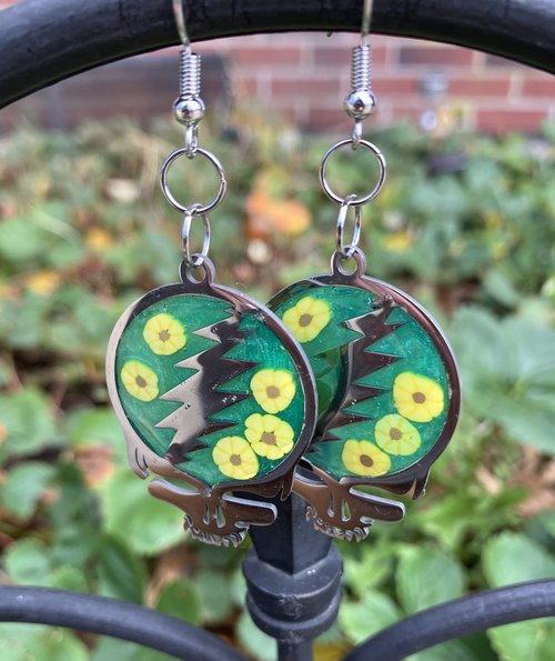 Handmade by Lucky Burrito Stealie earrings yellow flowers $18.00 $14.40 Only 1 available Quantity Stealie earrings measure 1in x 1.5 in length dangling just over 2.5 inches long. #handmade #gratefuldead #luckyburritoart #yellow
