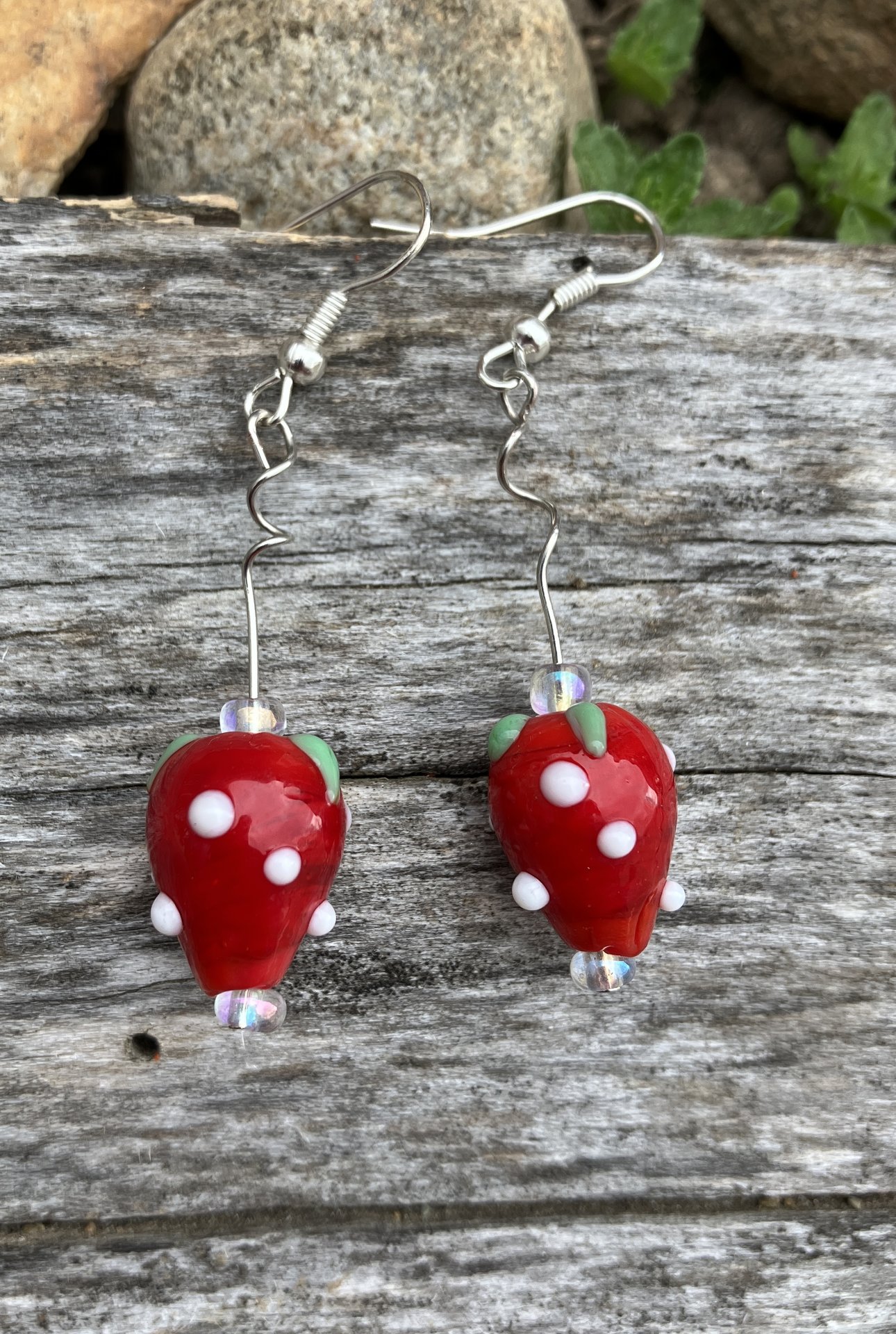 Lamp work strawberries glass beads fish hook earrings $15.00 $12.00 Only 1 available Quantity beautiful lamp work glass strawberrie beads on stainless wire fish hook earrings 2.00 inches plus the fishhook
